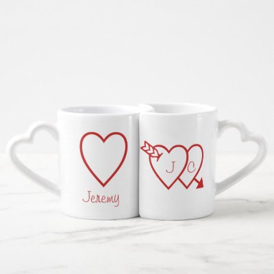 Both mugs show intersecting hearts with arrow, each heart has an initial. On other side, both mugs show a single heart with a different name beneath each. Personalize with Name 1/Initial 1 and Name 2/...