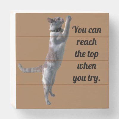 Cat stretching on hind paws, reaching for top of box. White cat with brown spots is wearing collar and standing on hind feet with tail stretched our for balance. Text at side reads "You can read the t...
